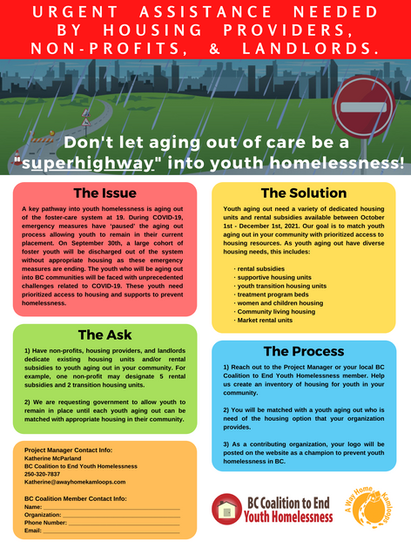 As a result of this ‘pause’, The BC Coalition to End Youth Homelessness (BCCEYH) is anticipating a significantly larger cohort of youth aging out across BC at the end of the September. The actual numbers of youth are not yet known. We are proposing a campaign to drive urgent action over the next month to raise awareness of the situation and put plans in place for all youths coming to the end of their time in care. This is an emergency and a real opportunity to make sure these youth do not fall through the cracks and risk ending up homeless.